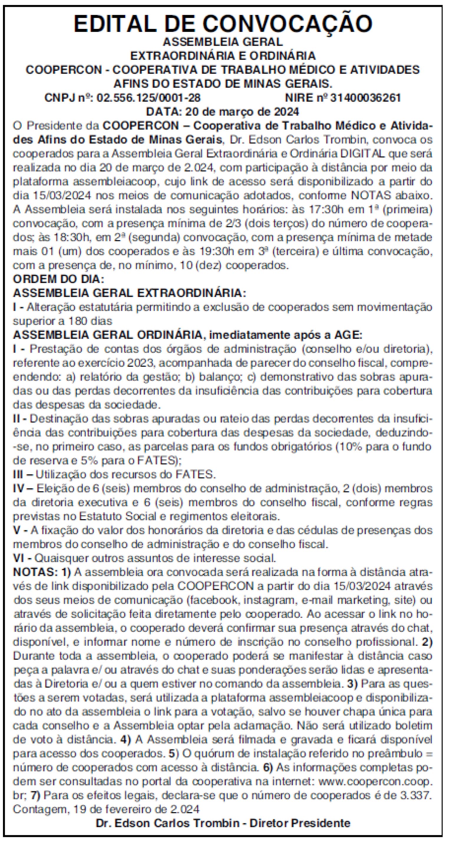 AGO – ASSEMBLEIA GERAL ORDINARIA 2024 Sua participação é fundamental, não deixem que escolham por você...