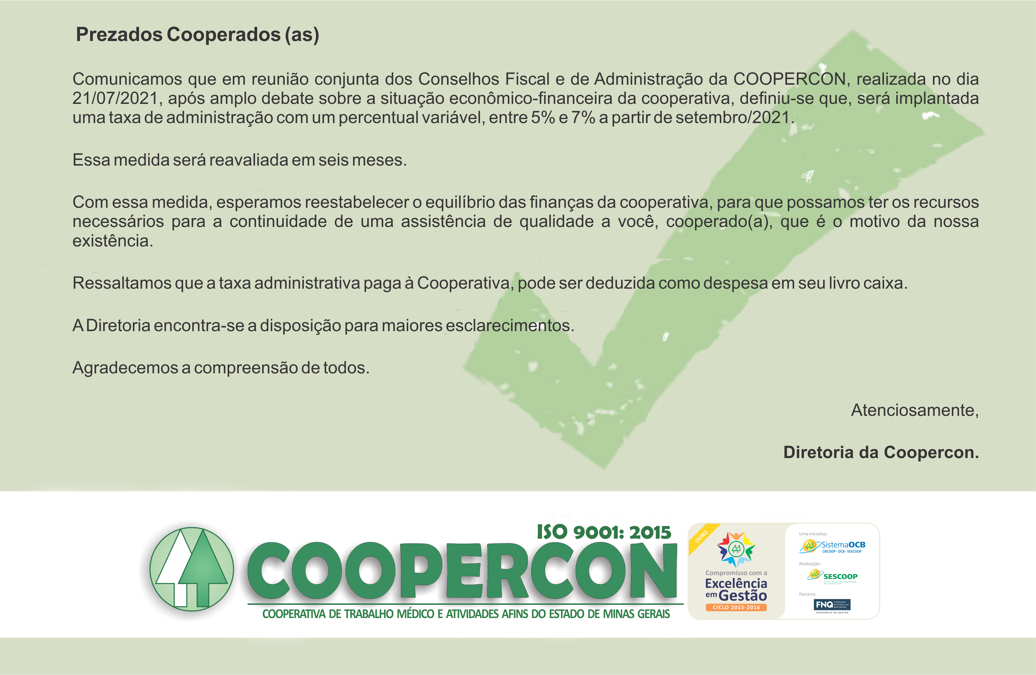 Segue comunicado referente a taxa de administração.